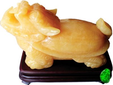 霸下,又名赑屓,形似龜,是老六,平生好負(fù)重,力大無窮,碑座下的龜趺是其遺像。傳說霸下上古時(shí)代常馱著三山五岳,在江河湖海里興風(fēng)作浪,后來大禹治水時(shí)收服了它,它服從大禹的指揮,扒山挖溝,疏遍河道,為治水作出了貢獻(xiàn)。洪水治服了,大禹擔(dān)心霸下又到處撒野,便搬來頂天立地的特大石碑,上面刻上霸下治水的功跡,叫霸下馱著,沉重的石碑壓得它不能隨便行走。霸下和龜十分相似,但細(xì)看卻有著差異,霸下有一排牙齒,而龜類卻沒有,霸下和龜類在背甲上甲片的數(shù)目和形狀也有差異。霸下又稱神龜,是長壽和吉祥的象征。它總是吃力地向前昂著頭,四只腳下下拼命地?fù)沃?,掙扎著向前走,但總是移不開步。我國一些顯赫石碑的基座都是由霸下馱著,在碑林和一些古跡勝地中都可以看到。在大玄空風(fēng)水上是可以化解內(nèi)六事煞氣,命局缺水的可以運(yùn)用其補(bǔ)水。